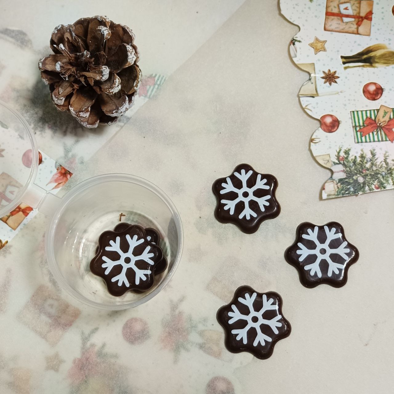 Готовый декор из темной шоколадной глазури в виде снежинок. С его помощью Вы легко и быстро украсите новогоднюю выпечку. Идеален для тортов и пирожных.